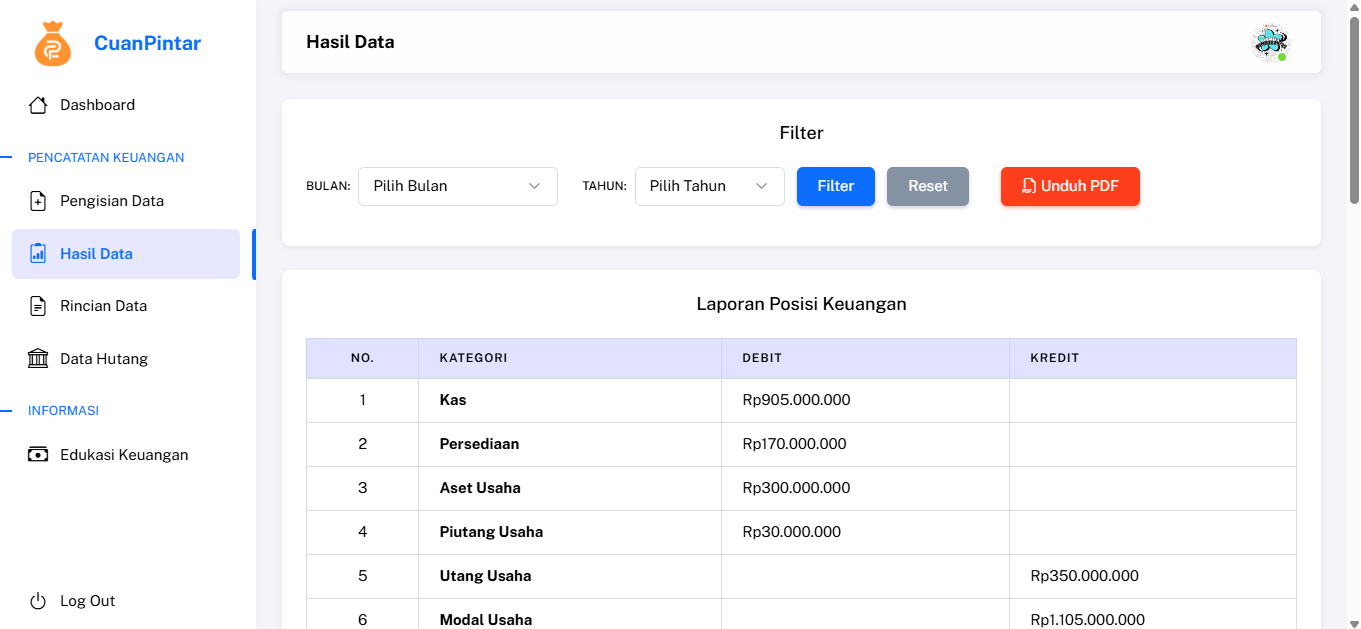 - Filter laporan berdasarkan periode bulanan atau tahunan.