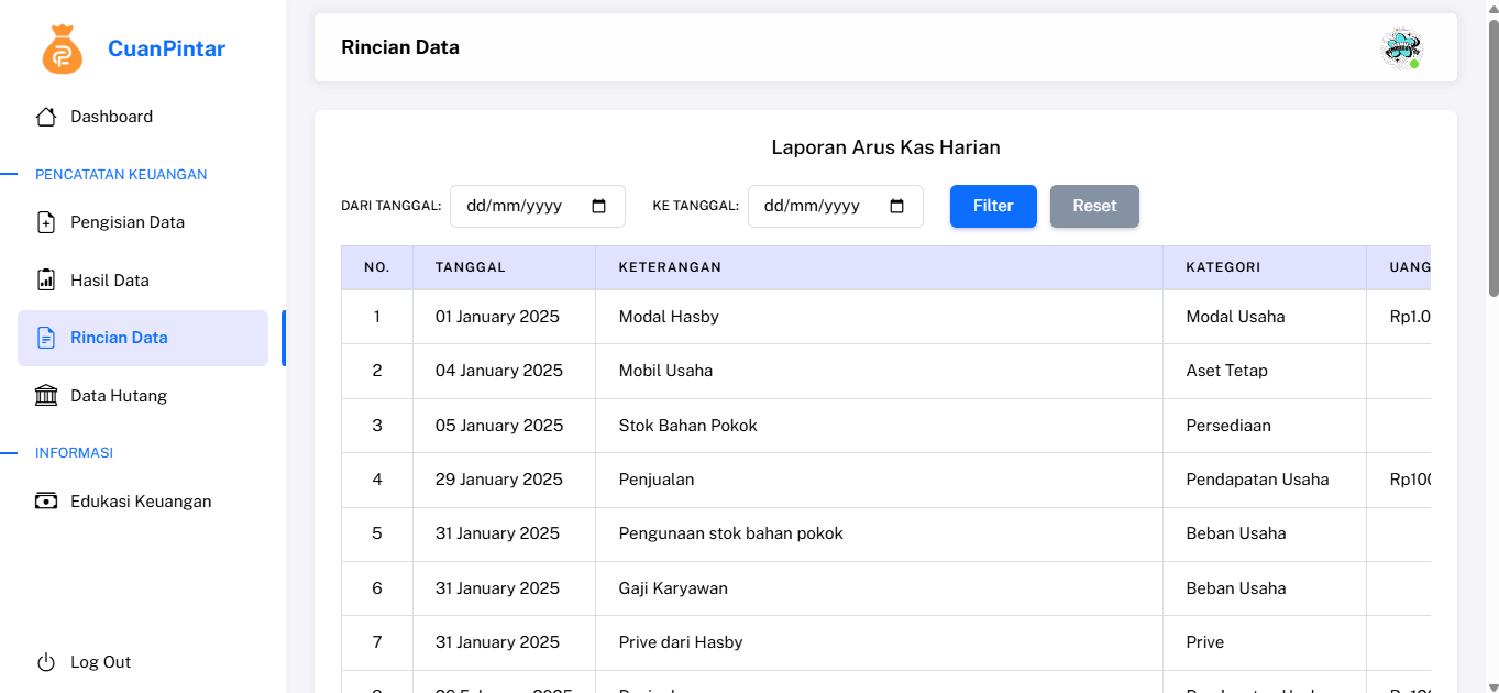 Dengan Rincian Data, pengguna memiliki kendali penuh terhadap setiap catatan transaksi keuangan.